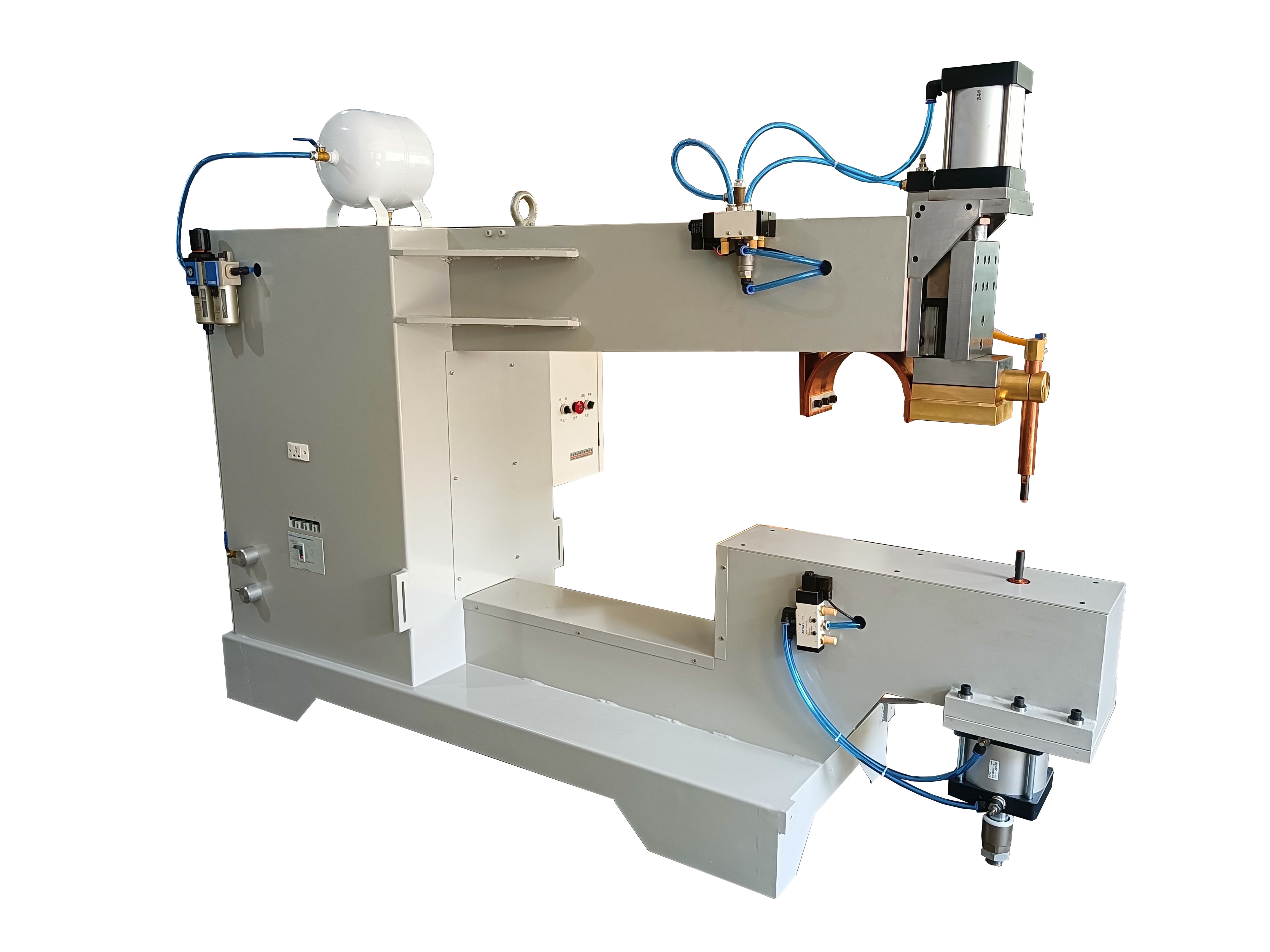 縫焊機(jī)就是指焊件裝配成搭接或?qū)咏宇^并放置于兩滾輪電極中間,滾輪電極加壓焊件并旋轉(zhuǎn),連續(xù)或斷續(xù)脈沖送電,形成一條連續(xù)焊縫的電阻焊機(jī)器。可以說(shuō),縫焊機(jī)是點(diǎn)焊中的一種演變。